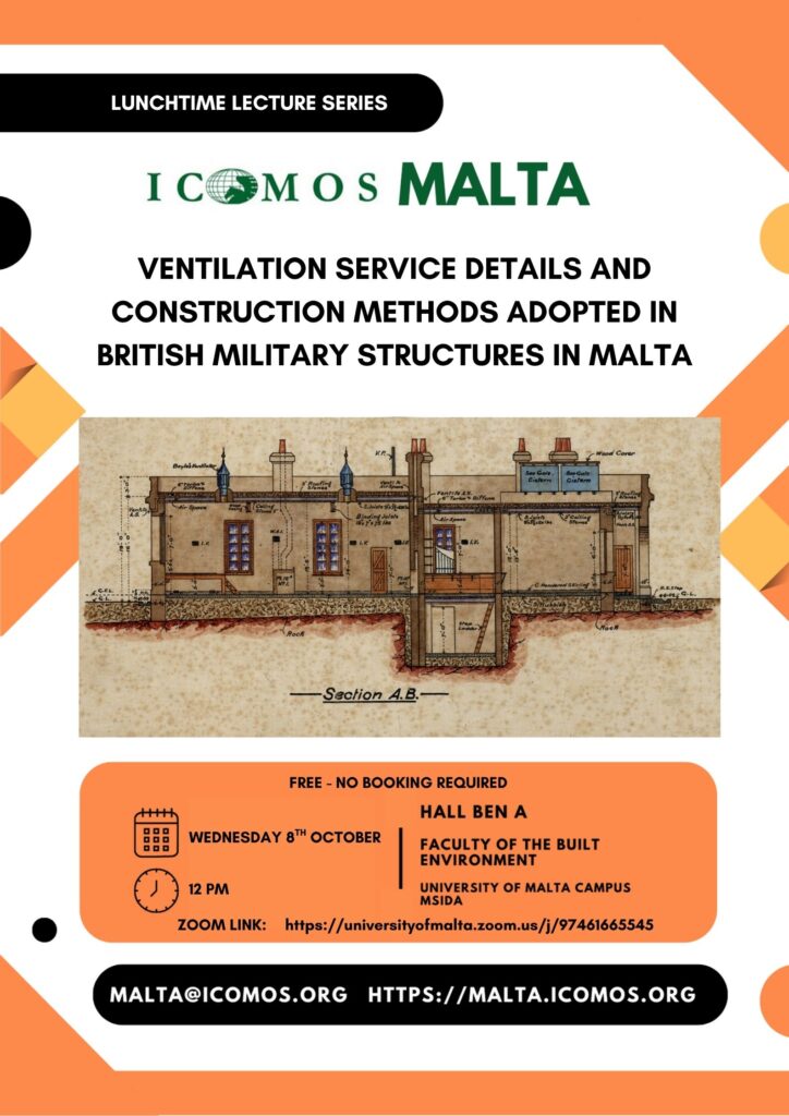 The first lecture in our series will describe the “Ventilation Service Details and Construction Methods Adopted in British Military Structures in Malta” and will be delivered by ICOMOS Malta Secretary Ms Charlene Borg.